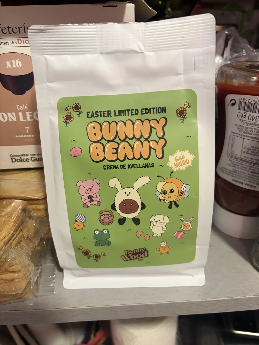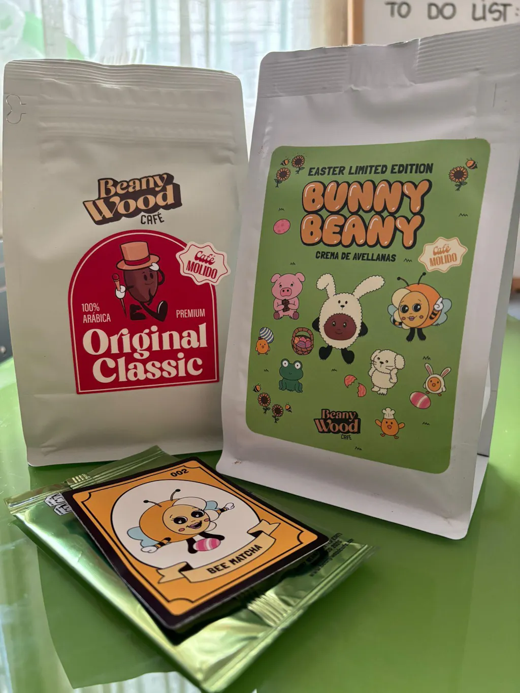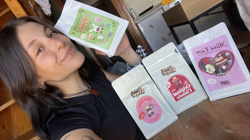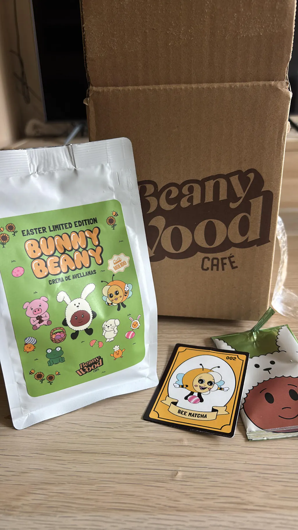 Cada paquete viene con un sobre y un cromo coleccionable dentro. Y si tienes suerte y te toca el cromo dorado… tienes café Beanywood gratis durante un año entero (sí, real).